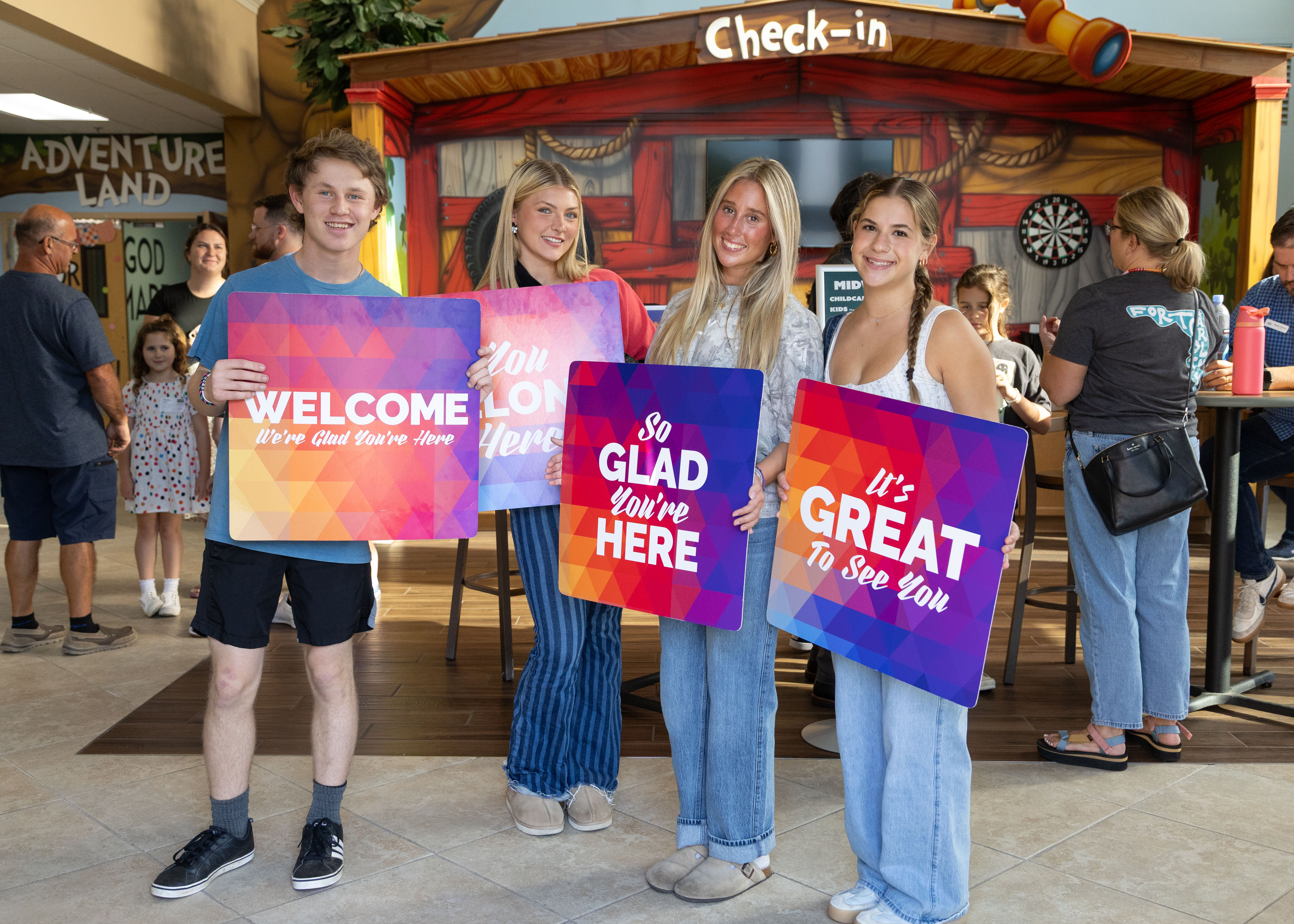 Check-in: Kids/Students - You're going to the two-story building! If you’re checking in a child, come inside the Kids Ministry Lobby (glass doors on the two-story building). Come a little early so you have time to check them in and get them to their spot. Volunteers will be there to help guide you.